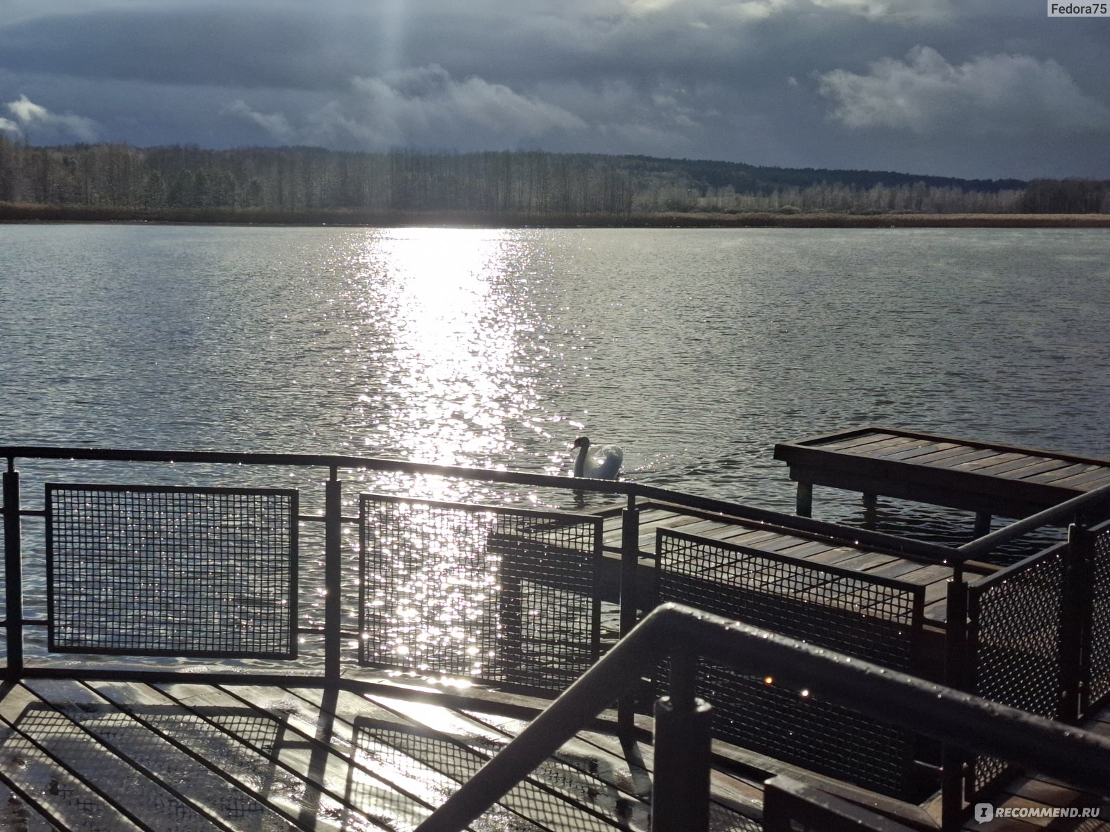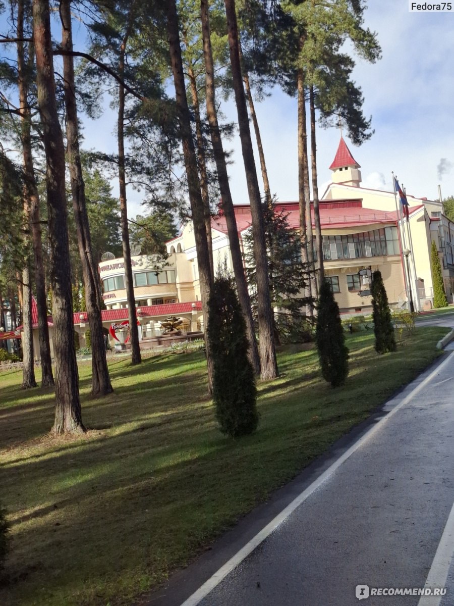 Территория большая, ухоженная, кругом санаторий окружает сосновый лес и с одной стороны озеро Паперня, где плавают белые лебеди.
