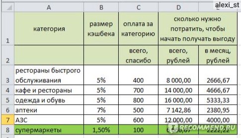 Расчеты неожиданно показали, что категория супермаркеты выгодна даже для меня) Если ваши обычные траты в месяц превышают суммы в крайнем правом столбце, то можете смело подключать категорию. Полностью окупится кэшбек и начнется выгода, когда сумма трат превысит сумму, указанную во втором столбце справа. Надеюсь, понятно написала, если что, уточняйте в комментариях.