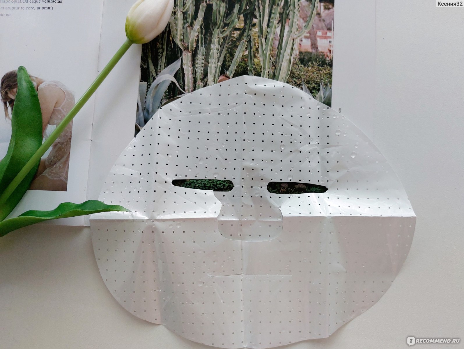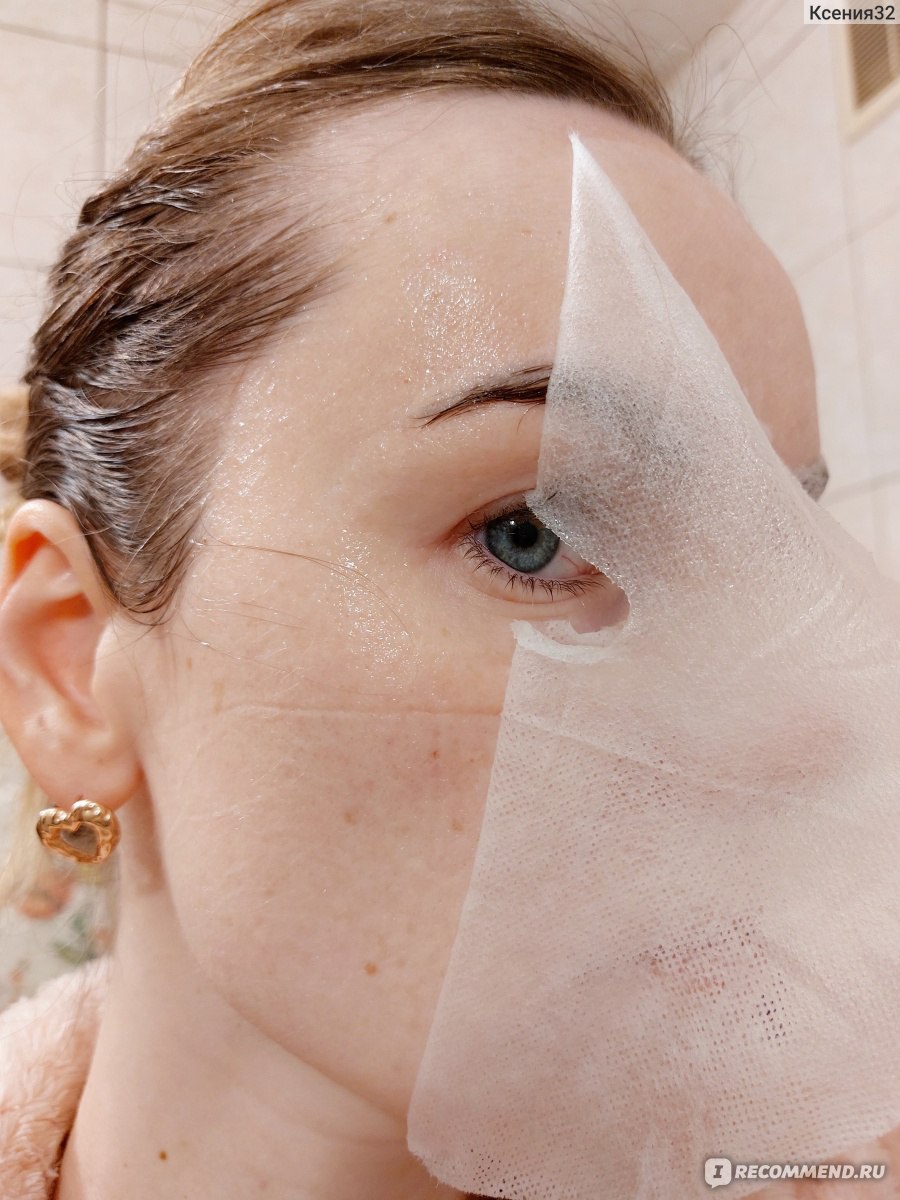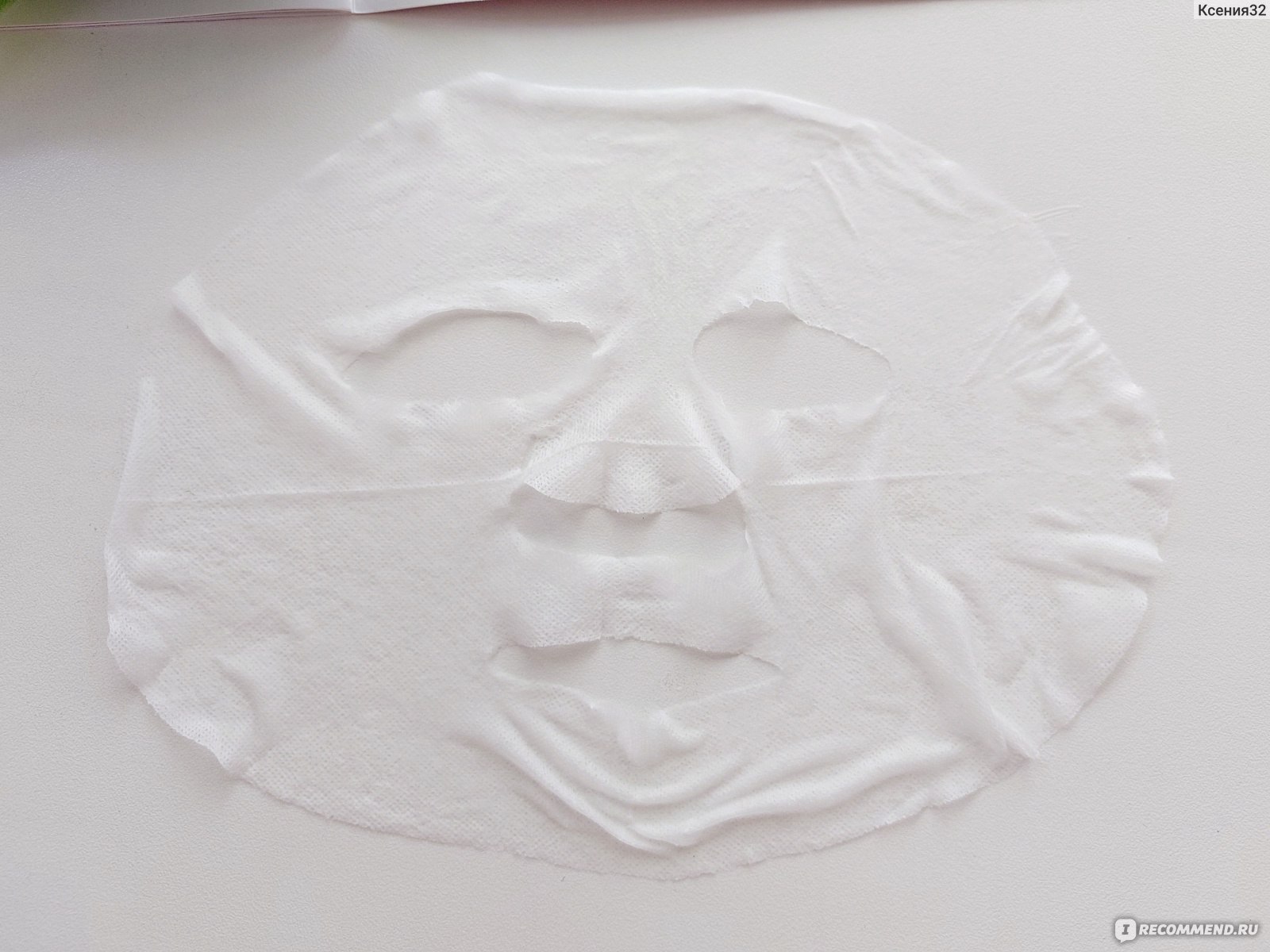 Маску я держу на лице примерно 20-25 минут, и спустя это время большая часть сыворотки уже впиталась, а сама тканевая маска начала подсыхать и выглядит от так: