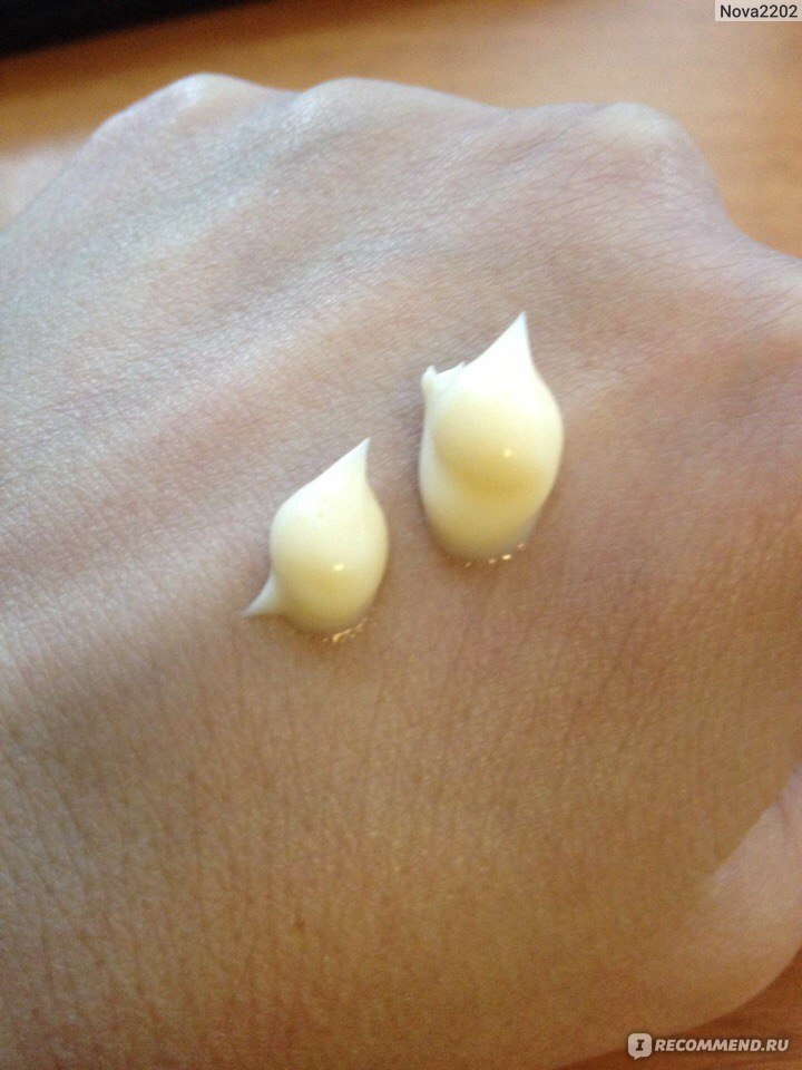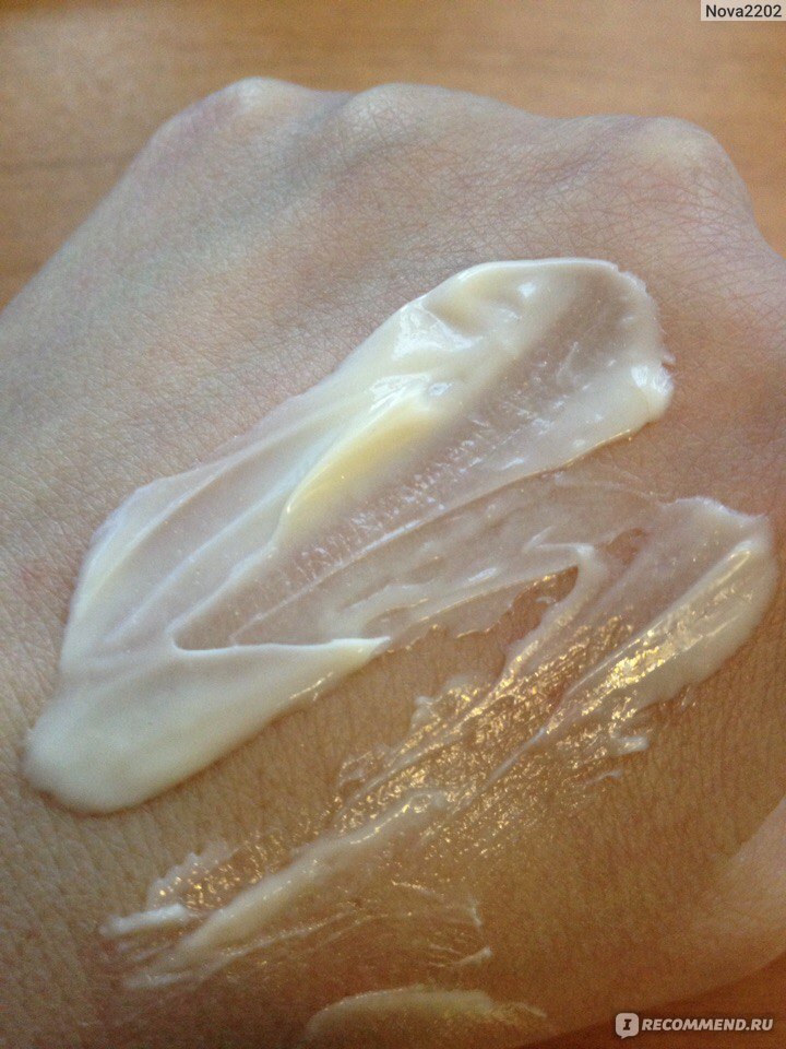 Крем имеет желтоватый цвет, достаточно легкую текстуру, мягко распределяется по коже и вроде даже как быстро впитывается: