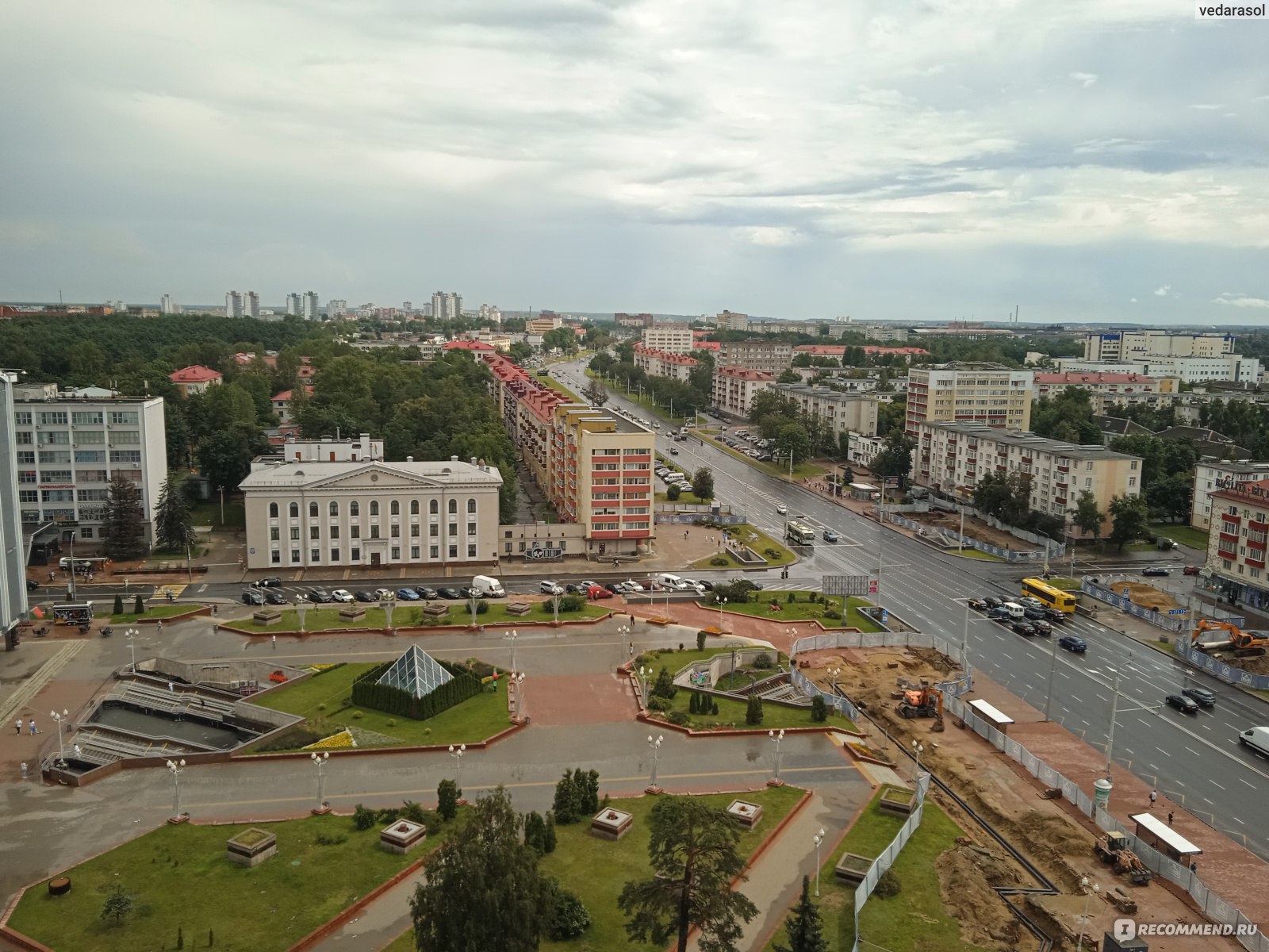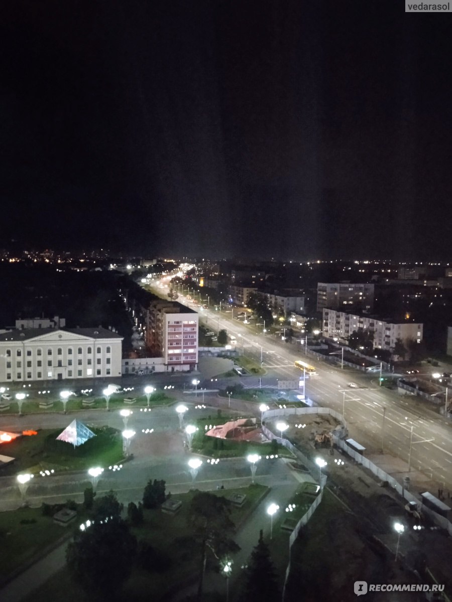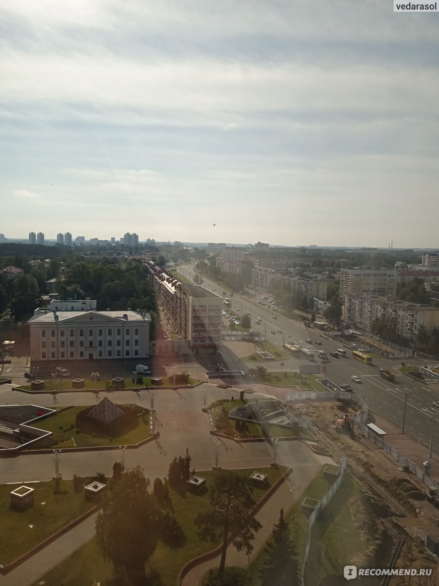 Не могу не похвастаться видом из окон, который у меня был. Слева универмаг "Беларусь", который в темное время подсвечивается зеленым и красным цветами. Да и сама гостиница в темное время подсвечена зеленым.