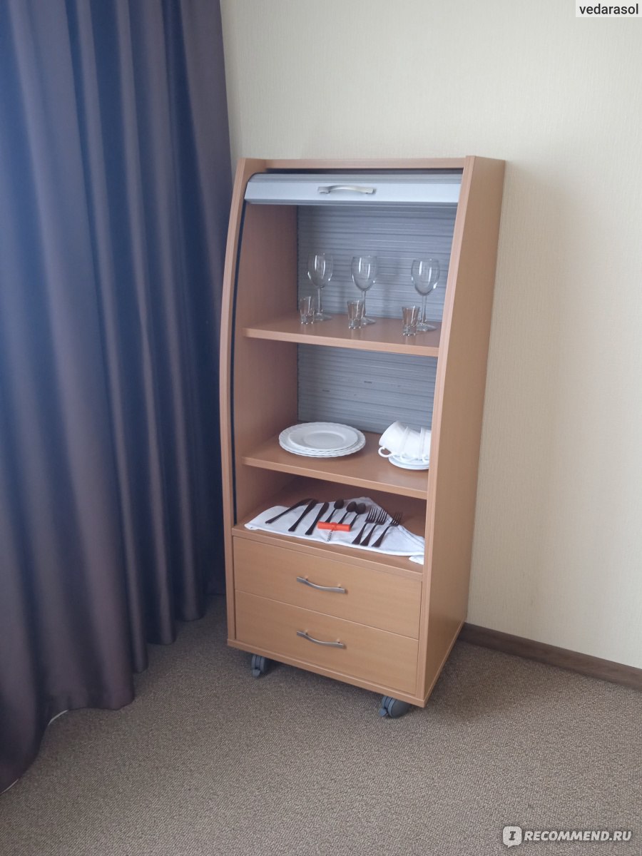 У меня был номер на 15-м этаже (последний этаж). По моим меркам это даже не комфорт плюс, а люкс. Почему? Обычно в одноместных номерах это одна комната, в которой всё и санузел. Здесь же две комнаты. В первой комнате мини-холодильник, на котором стоит телевизор, вместительный диван, шкафчик с посудой на три персоны и кондиционер.