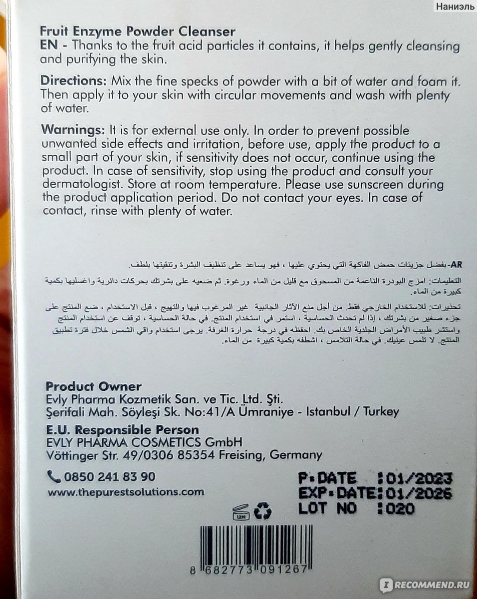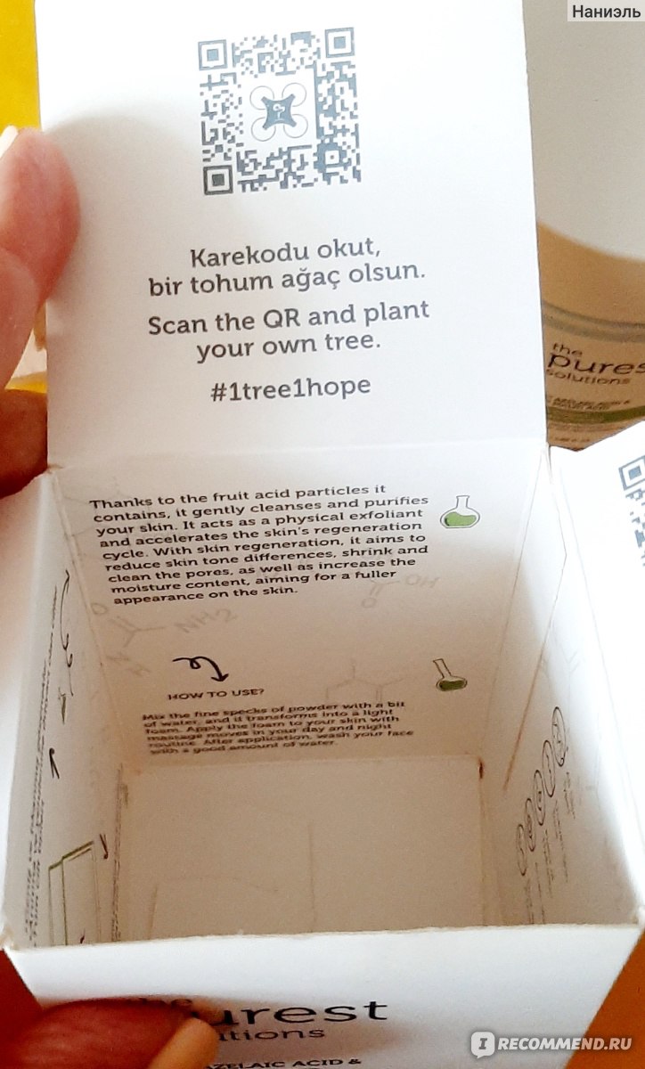 Кожа у меня нормальная, склонная к жирности, поры расширенные. От гелей и пенок для умывания лицо чешется. Поэтому умываюсь только порошковыми умывалками. Одна из самых любимых и эффективных это вот эта энзимная пудра. Поры очищает прекрасно с первого раза, черные точки уходят легко, лицо не высушивает, кожу смягчает, мелкую подкожную сыпь убирает (*правда не сразу, через 3-4 применения, но все равно убирает), городскую грязь/пыль/пот смывает просто великолепно. Стоит помнить, что в составе есть фруктовые кислоты. Так как у меня тональник все равно с spf, после утреннего умывания и похода на работу, никаких негативных последствий не замечала. Даже без spf пару раз на солнце никаких пигментных пятен не появлялось, но опять же особенности отношений кожи с солнцем у каждого свои 😊 Кроме того, упаковка у неё очень интересная. На упаковке есть qr-код, если его прочесть переходишь на страницу эко-активистов, которые сажают дерево от твоего имени. Радости от этого действия не описать 😊 Средство прекрасное, деликатное и эффективное, очень советую.