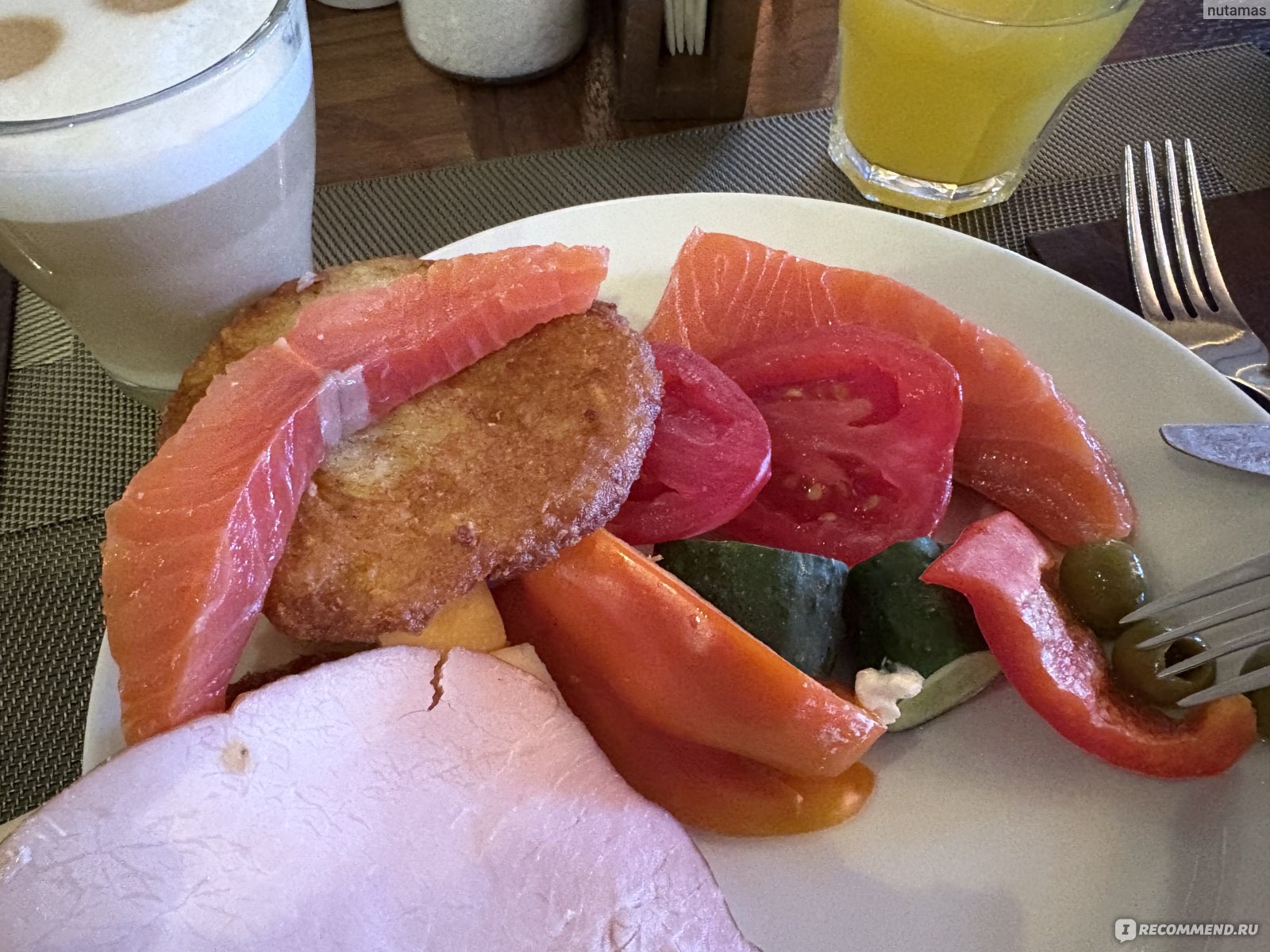 Завтрак выше всяких похвал: огромные куски лосося, много вкусной еды, огромной выбор, вкусный кофе. Столиков хватает для комфортного размещения. Официанты очень ненавязчиво убирают грязную посуду.