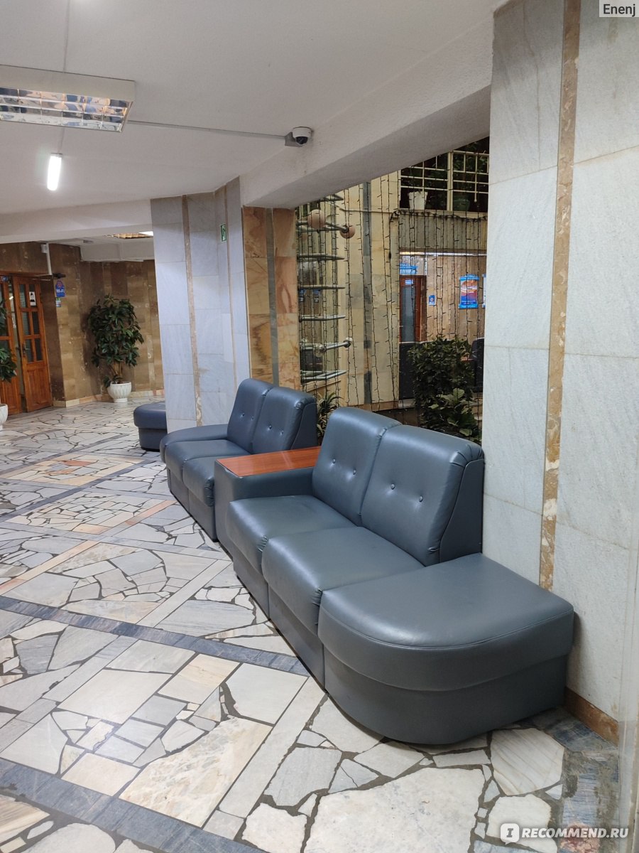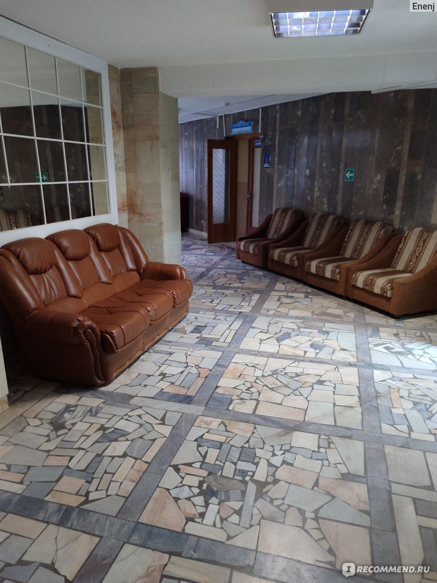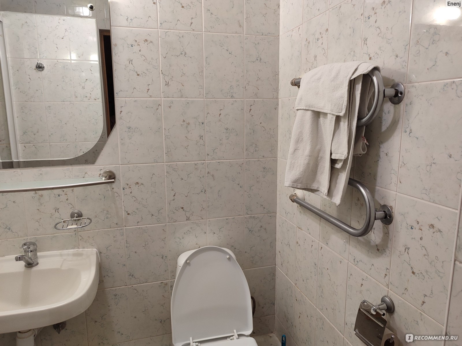 Выдают одно полотенце для тела и одно для лица. Маловато. В Юбилейном давали ещё полотенце для ног. Там ещё можно было бросить полотенца на пол. Это означает, что их можно забирать и выдавать новые. Здесь полотенца, кажется, ни разу не меняли. На двоих дали одно маленькое мыло. Геля для душа, шампуня, а тем более зубной щётки нет. Потом ещё принесли парочку штук мыла. Фена нет. Лежит один на стойке администратора, можно попросить. Туалетная бумага была, серая, но не совсем жёсткая. Потом принесли ещё рулон, когда первый не закончился. Зеркало, раковина, унитаз чистые.