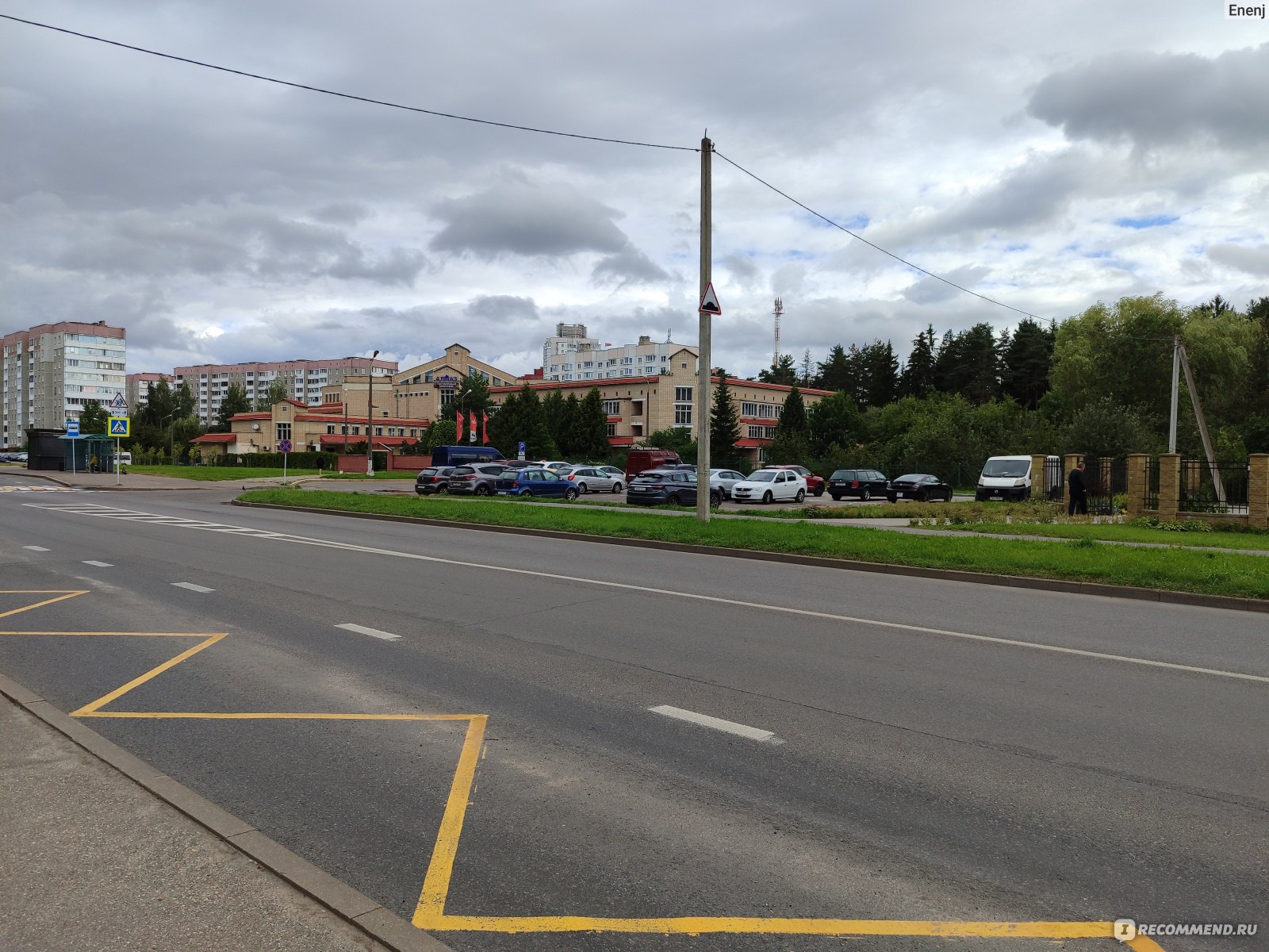 Нас встречает вот такое здание. Если ехать от Могилёвской станции метро на 61 автобусе, то он подкатывает прямо к гостинице. Остановка Герасименко.