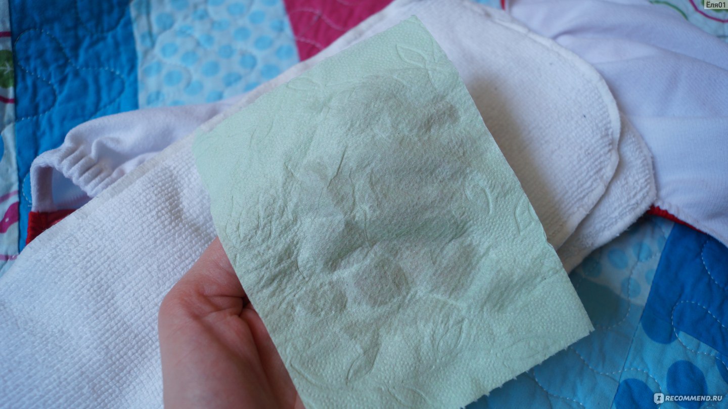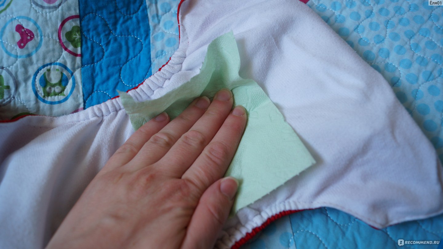 Кстати! Эта фотография сделана через 4 месяца использования подгузника. Вы сами можете видеть, что, невзирая на атаку детских неожиданностей, белый внутренний слой остался вполне белым) Катышки появились, но на функциональность это не влияет.