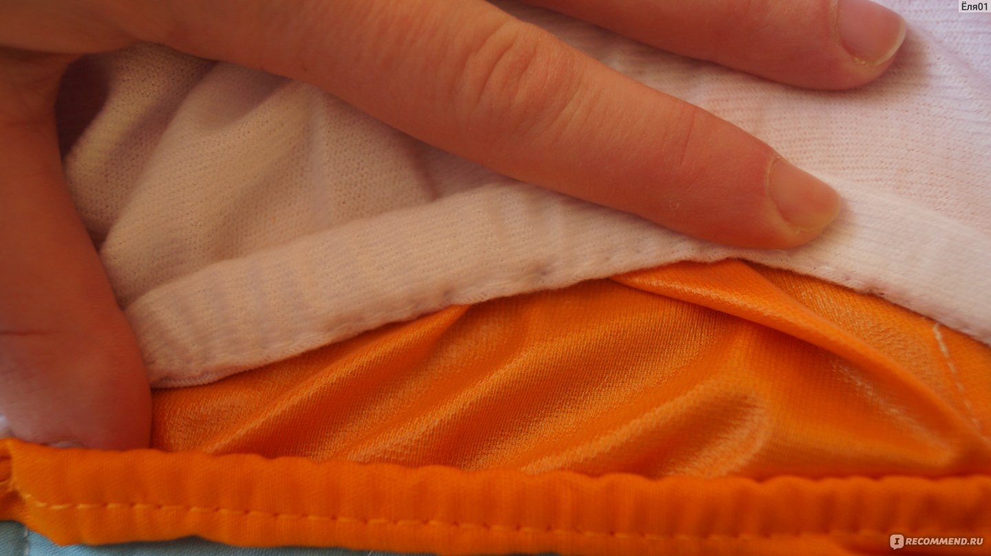 Сразу отмечу, что при первой стирке красный подгузник слегка полинял на белый внутренний слой (но после второй стирки следы исчезли). Также была замечена пара торчащих ниточек, но это некритично, швы не расходятся.