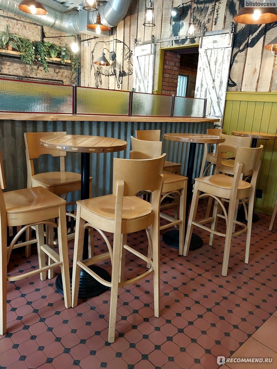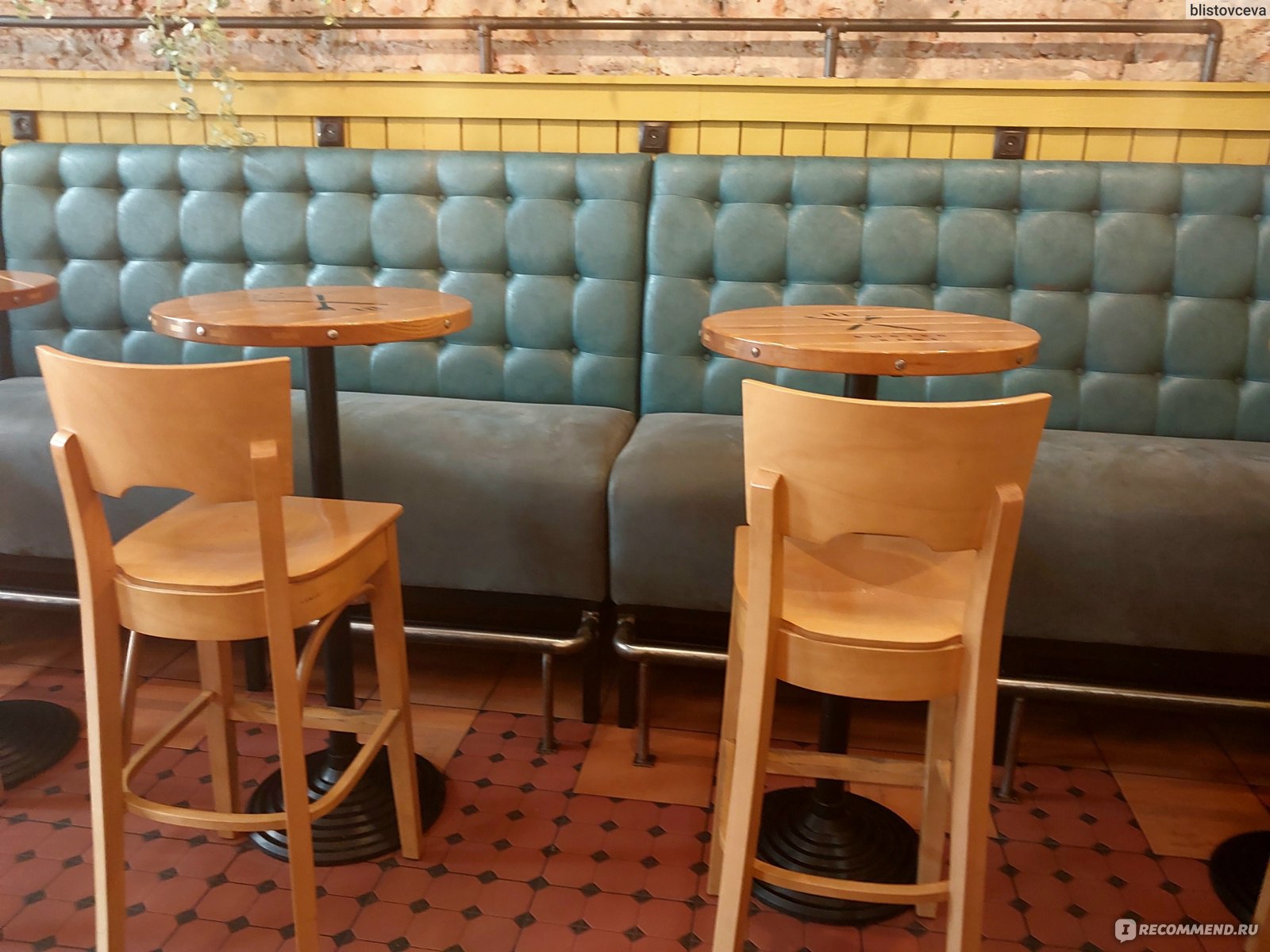 Высокие деревянные столики и барные стулья либо кожаные диваны.