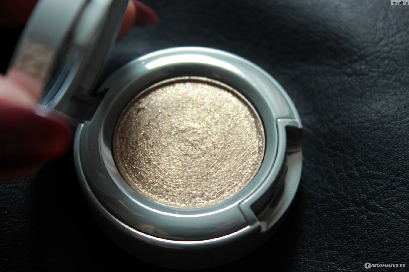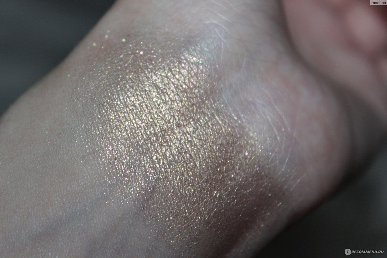Сами тени искрящегося золотого цвета с розовыми и серебряными блестками. По текстуре это микс из пудровой теневой базы и мелкого глиттера. Я постаралась уловить это на фото.