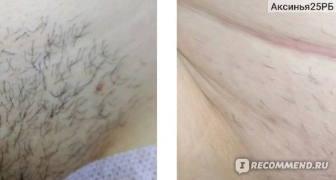 За 4 процедуры (360 мин) мы успели обработать только лобковую область, уже есть видимый результат. На фото слева до,