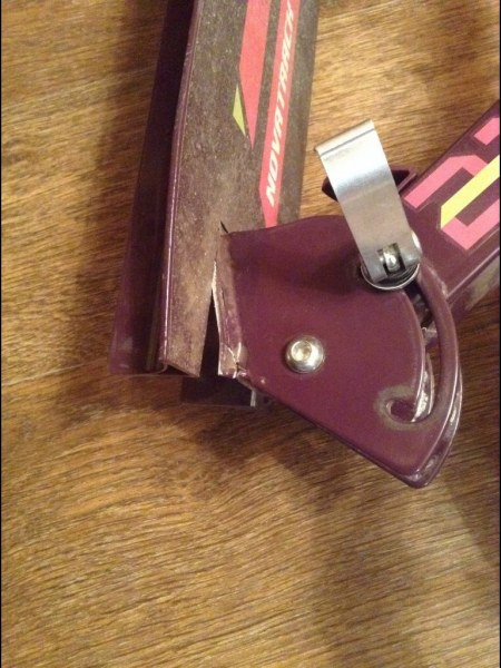 Характеристика: грузоподъемность до 100 кг - на деле оказалось не соответствующая действительности. Возможно, ребенок еще бы катался на данной модели самоката если бы производитель указал реальный вес допустимой нагрузки, судя по толщине металла в месте разрыва это не более 50 кг.