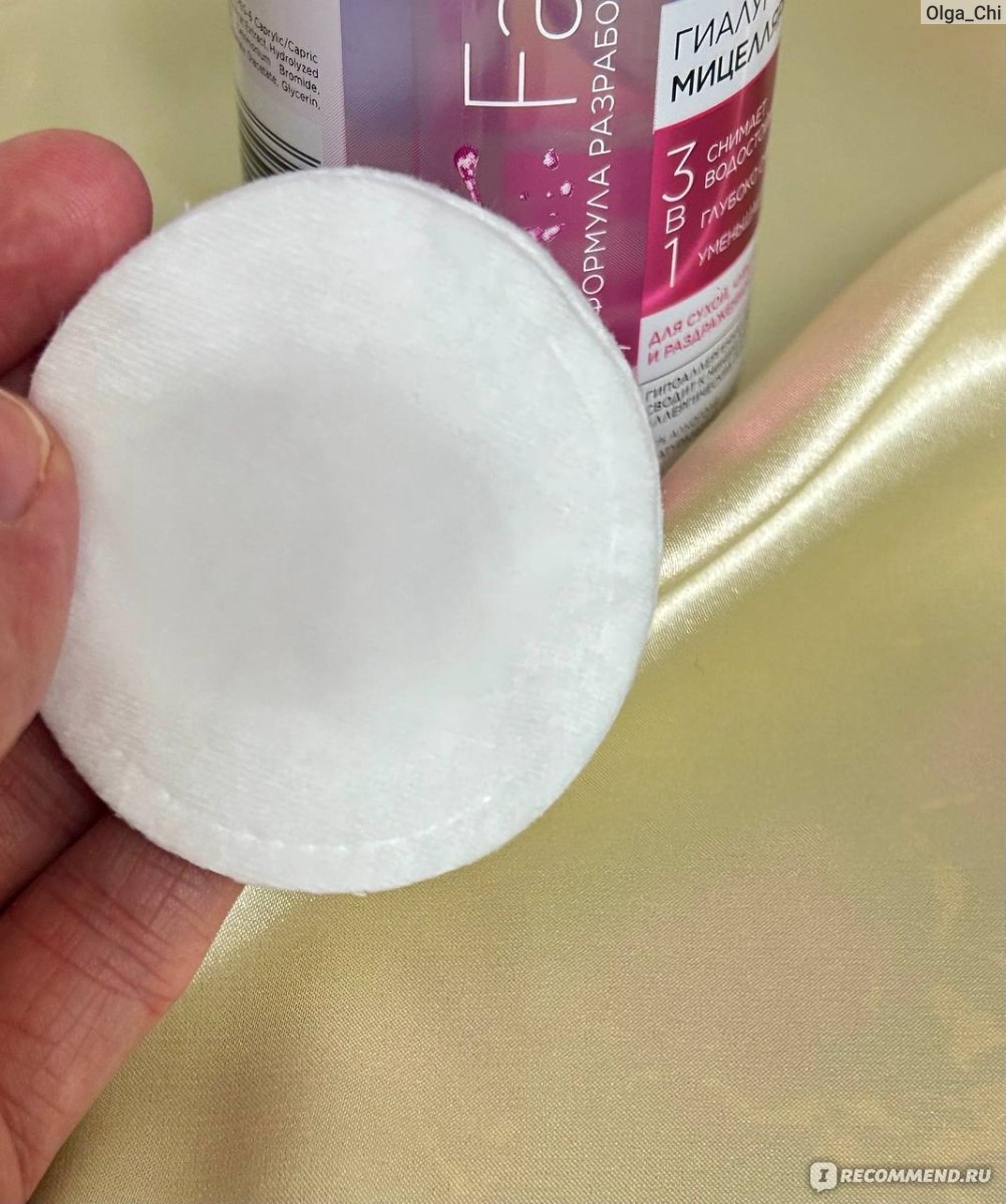 Воду нужно нанести на ватный диск, точнее, прям так обильненько смочить его. У меня уходит примерно 2-4 диска на снятие повседневного макияжа (обычно это тональный крем, румяна, хайлайтер, тушь). Если тушь влагостойкая, то даже глаза могу не трогать, так как она смывается теплой водой. Но если обычная, то обязательно смываю мицелляркой.
