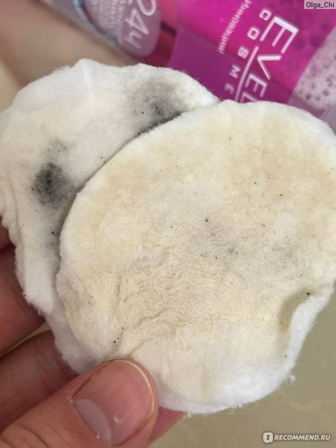Мицеллярная вода работает мгновенно: 2 взмаха ватным диском и вся тоналка на нем. Тушь тоже смывает, но это необязательно в данном случае.
