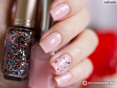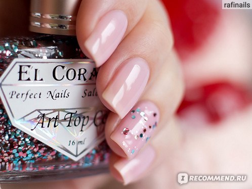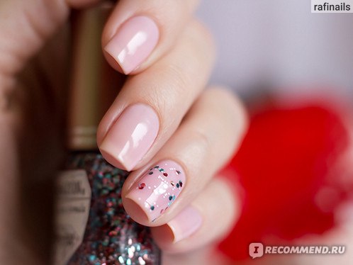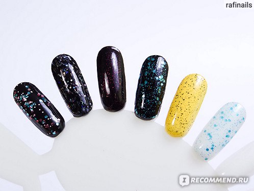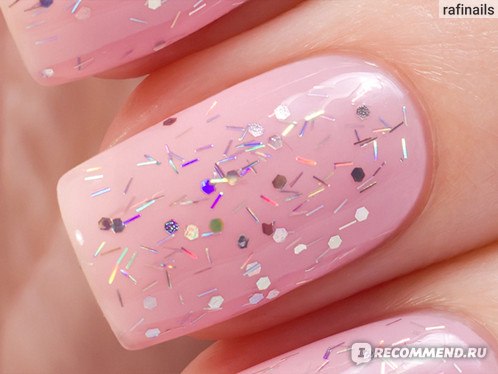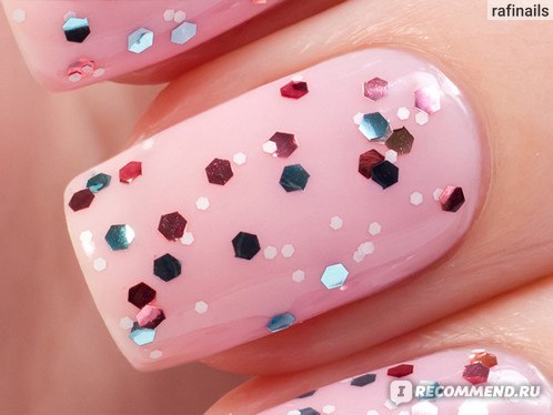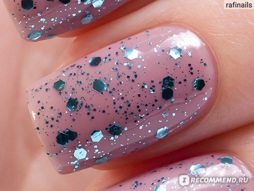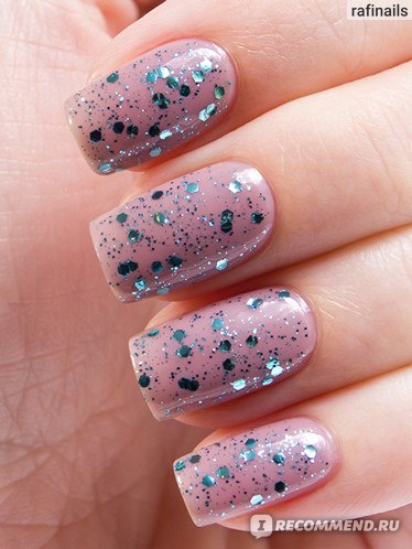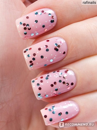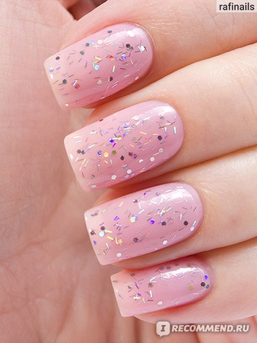 В базе содержится крупный глиттер шестиугольной формы розового и голубого цвета, а так же среднего размера белые вкрапления. Очень похож на OPI The Living Daylights, но в OPI нет белых точек. Этой мой фаворит среди представленных 5 топов.