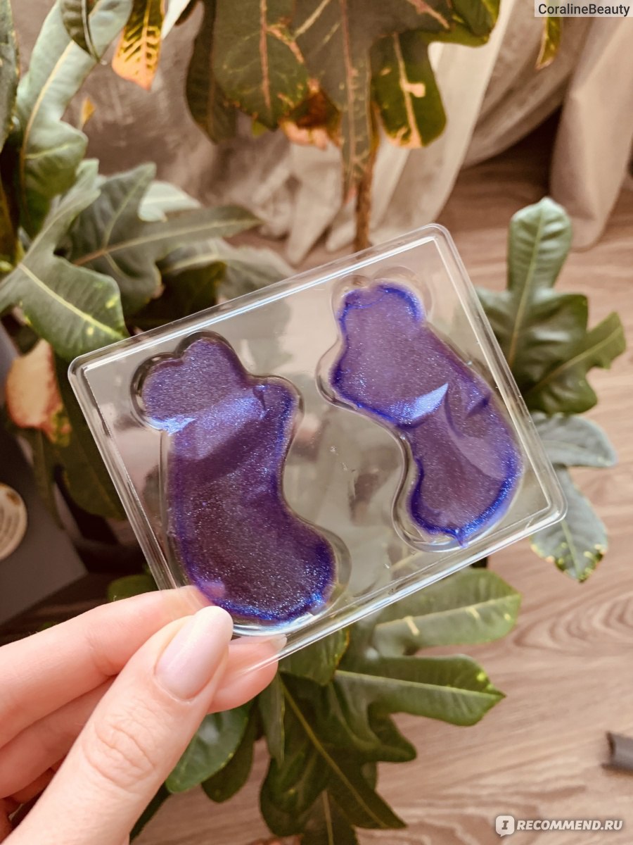 Патчи сами по себе гидрогелевые, фиолетовые, с блестками, смотрятся очень симпатично. На ощупь они мягкие, тонкие, достаточно большие по размеру — перекрывают всю область под глазами и даже немного заходят на скулы. Это удобно, потому что эффект может быть более комплексным.