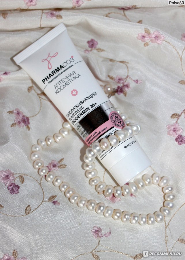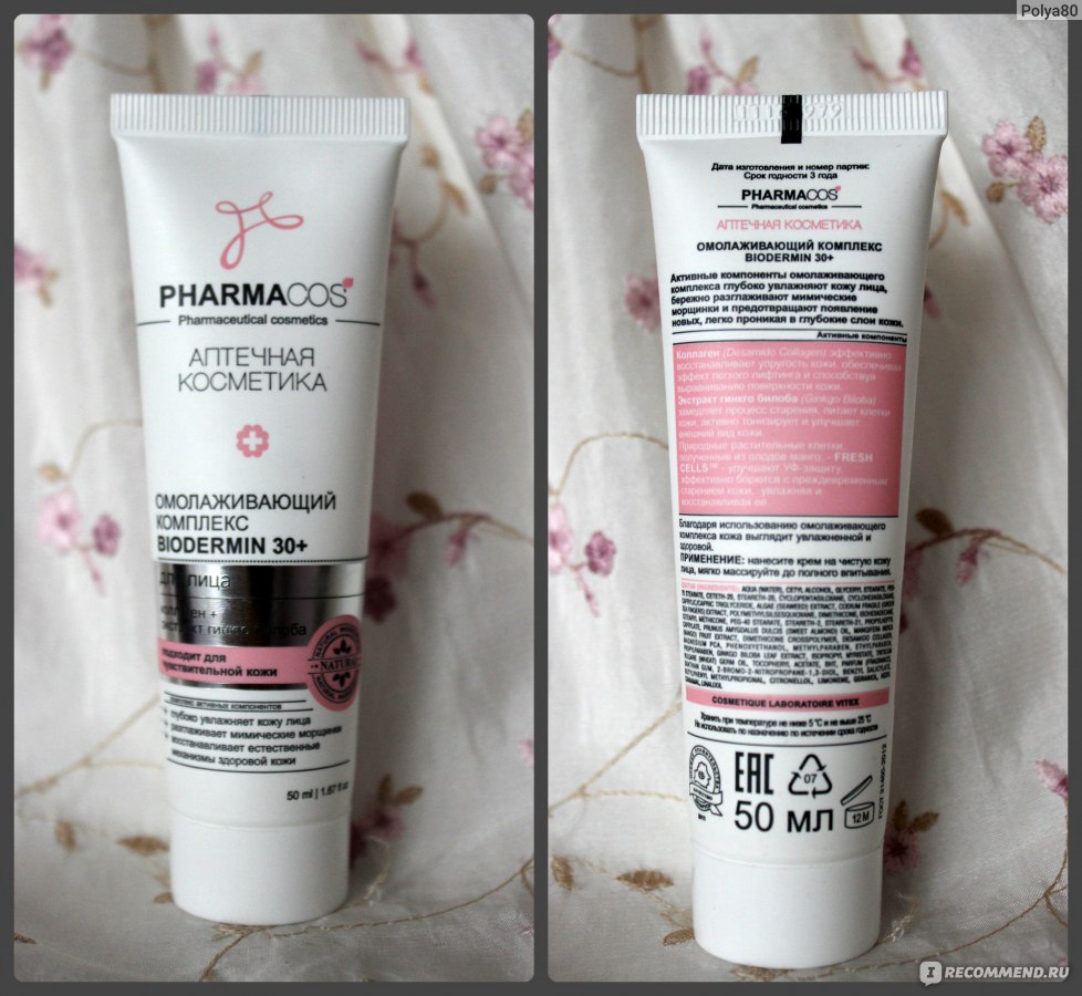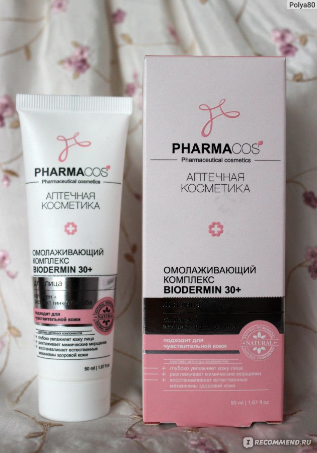 Отмечу, что эту линию ее создатели позиционирует как аптечную косметику. Среди приобретенных средств оказался и омолаживающий комплекс для лица «Biodermin 30+», который, по заверениям производителя, должен помочь нам увлажнить кожу и бороться с мимическими морщинками (разгладить имеющиеся и не допустить появление новых).