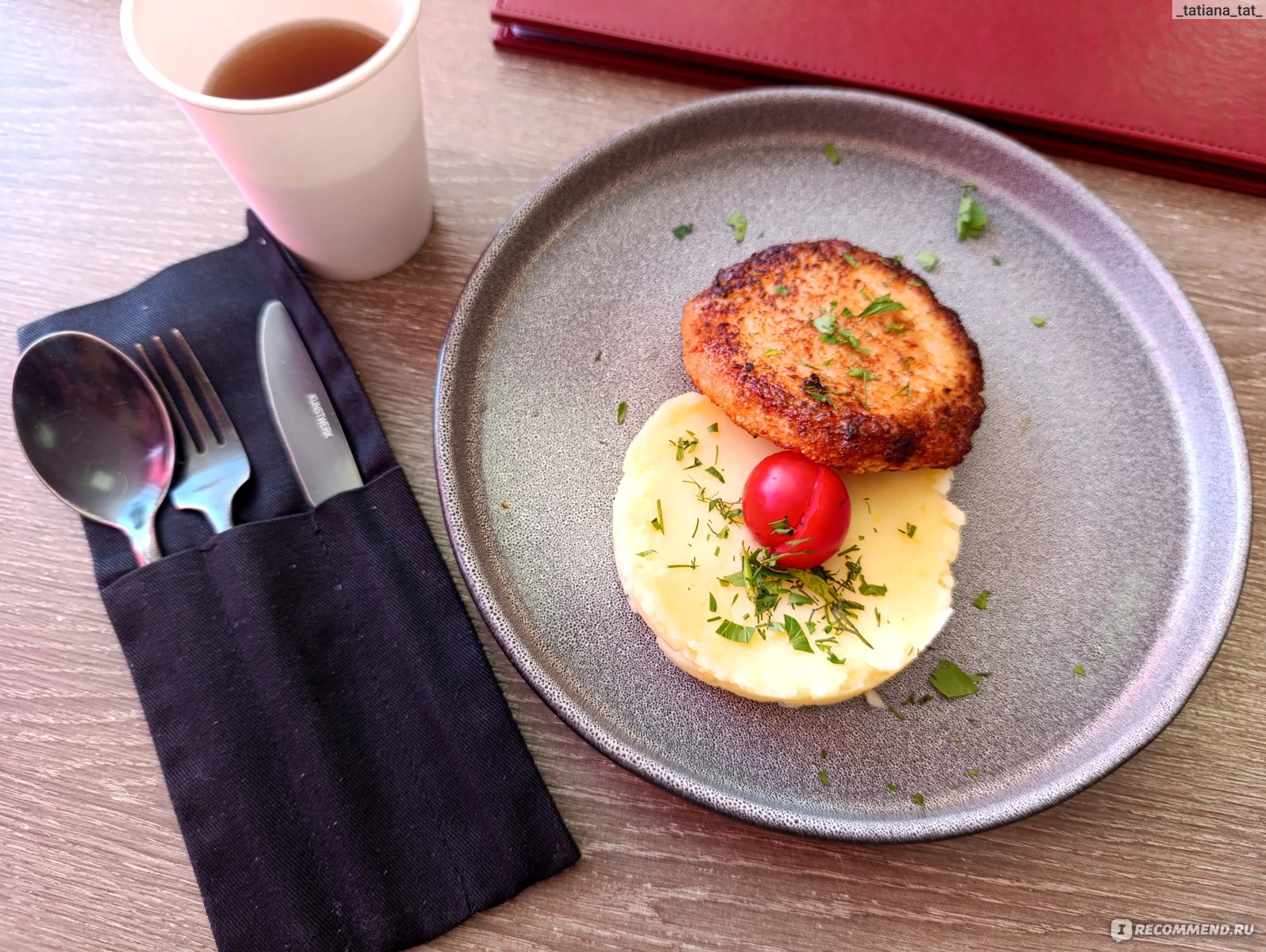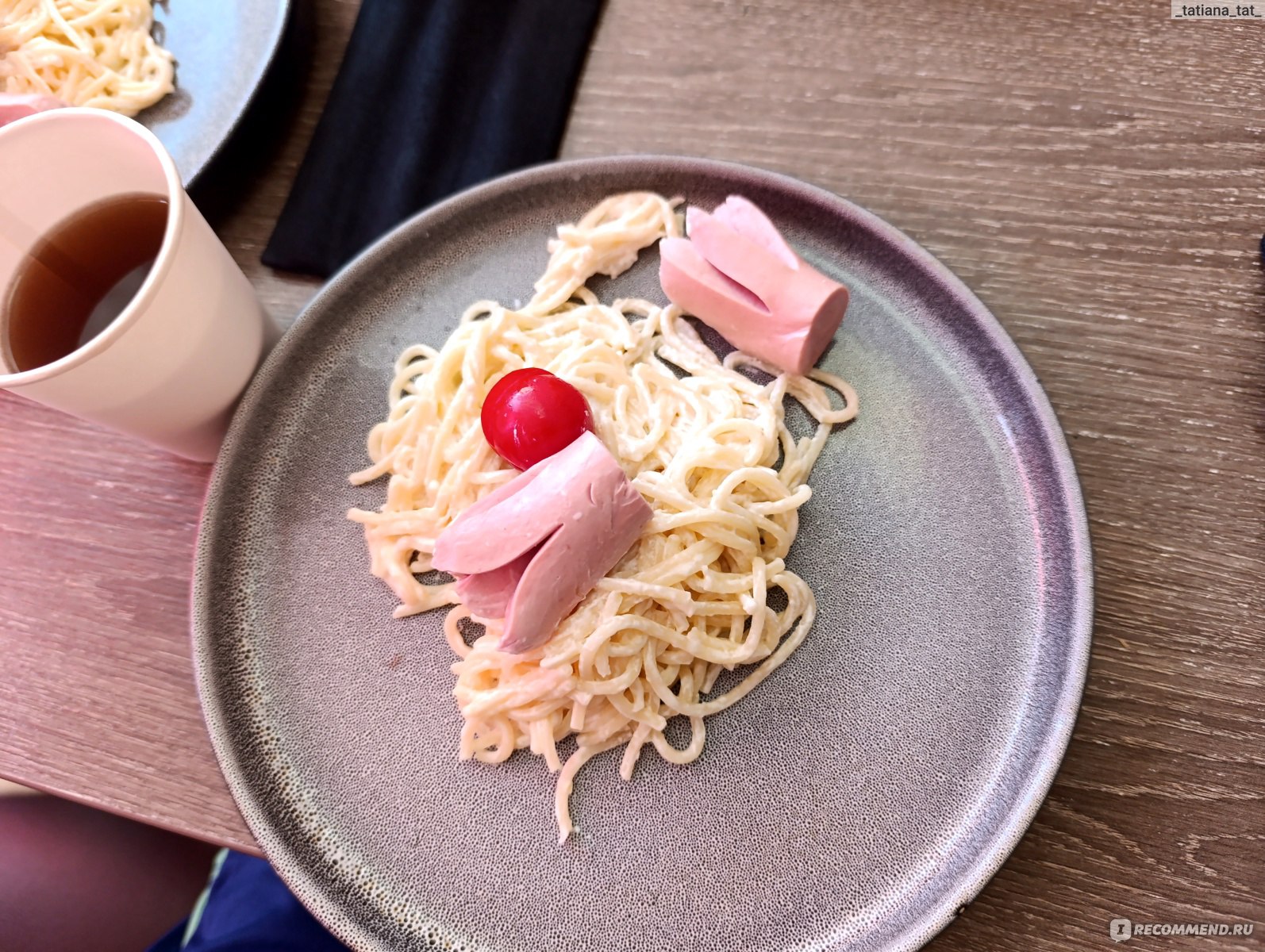 Заказали мы 2 порции макарон с сосиской и пюре с котлетой.