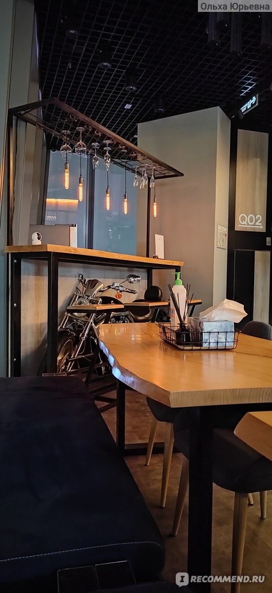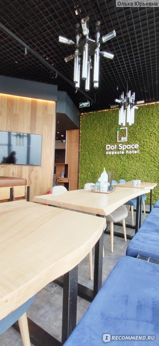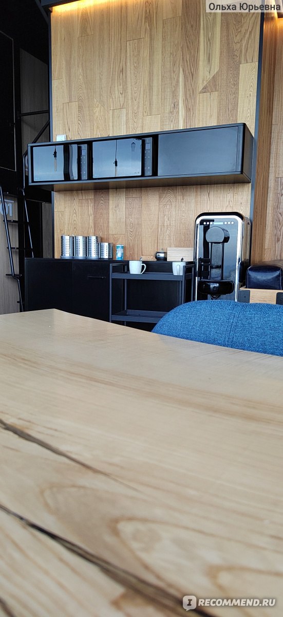 В холле общее пространство со столами и лавками, диванчики с приставкой PS4 и ТВ, буфет с посудой, бесплатной водой и чаем, барная стойка с арт-объектом, за которой кухонька. Туда заходить нельзя - там персонал готовит завтраки и кофе. Всё в стиле лофт и современном стиле.