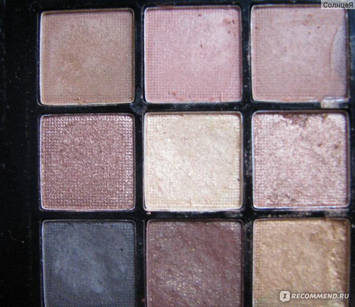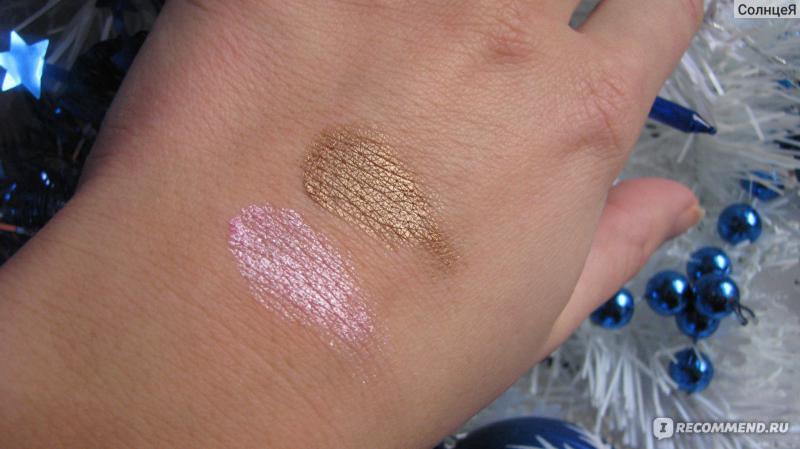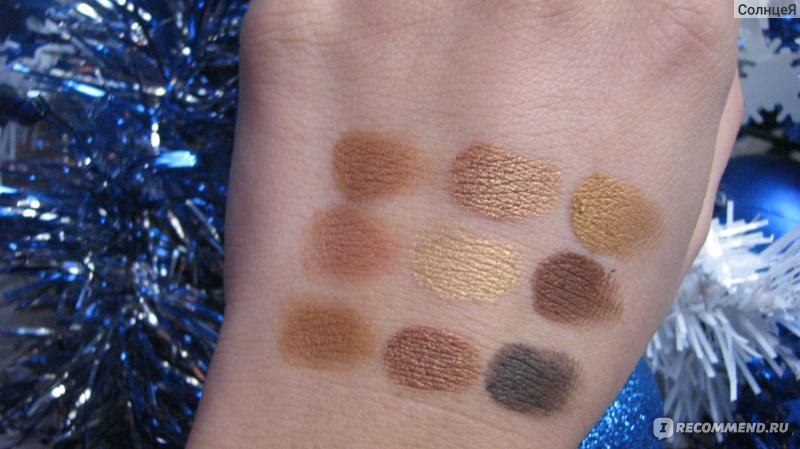 Тени - просто находка для любительниц "золотисто-бронзового макияжа". Как видно из фото №3 в палетке есть и матовые (первый ряд, но все же с мелкими не уловимыми частицами шиммера) ) и шиммерно-лаковые оттенки, все очень хорошо пигментированы (менее всего самый темный оттенок), отлично ложатся и с базой и без (на фото 3 - с базой), и не "исчезают в полночь".