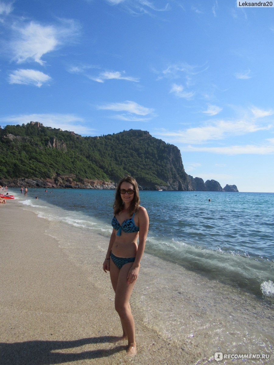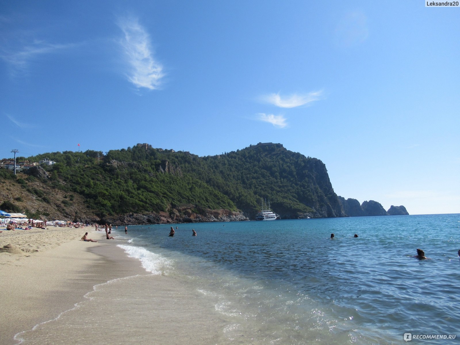 Здесь бархатистый песок, множество кафешек, прозрачное чистое море и прекрасный вид на Аланийскую крепость, расположенную на отвесной скале. Народу в середине октября еще достаточно много, но уже не столько как в высокий сезон. Мы без особого труда находили себе подходящее место на пляже. Советую всем идти на тот участок пляжа, который ближе к скале с крепостью, т.к. это наиболее широкий и удобный для захода в море участок пляжа. Сразу скажу, что заход в море не очень удобный на всем пляже (под водой не очень ровная и местами скользкая каменная плита, плюс достаточно сильная волна), для отдыхающих с детьми это может быть проблематично. Мы же быстро приспособились к такому заходу в море, тем более что вода здесь кристально чистая, а море невероятно ласковое, нужно лишь немного отплыть от берега.