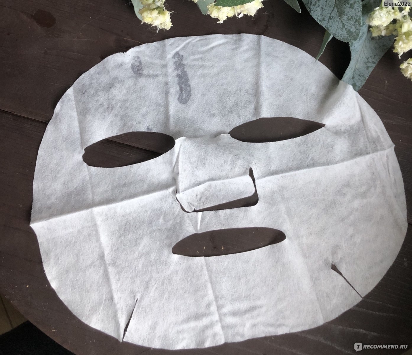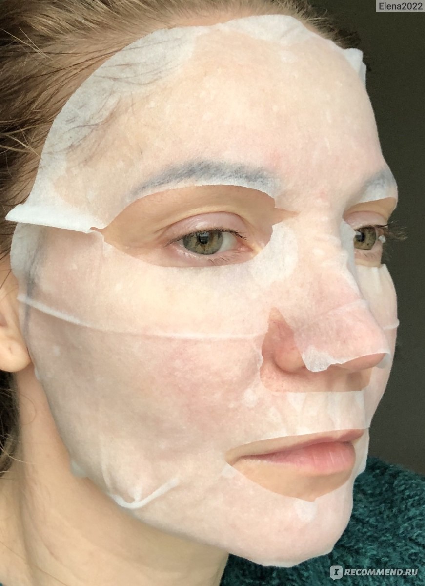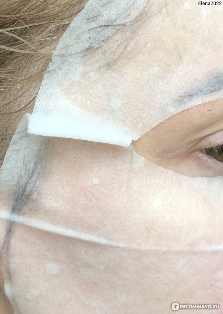 Сама маска выполнена из грубоватой (на мой взгляд) ткани, уже давно производители используют более мягкие и тонкие материалы, а эта какая-то как из целлюлозы. Лекало тоже не совсем удачное, лично мне не хватает прорезей ещё и на скулах, там маска собралась каким-то горбом и топорщилась.