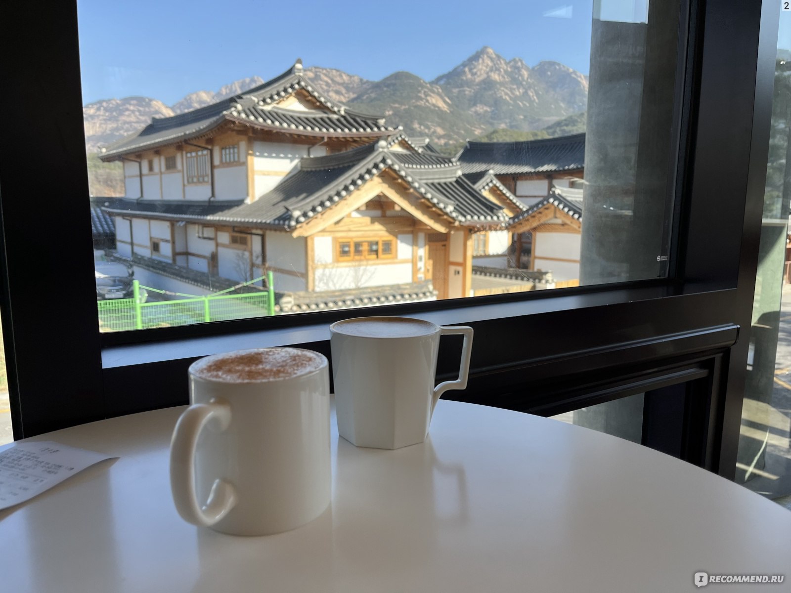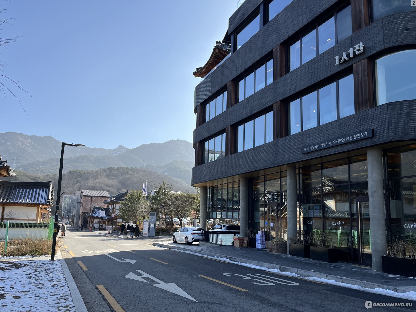 Но вообще траты на кофе можно полностью проигнорировать и по лестнице подняться на последний этаж Irin Iljan. Это бесплатно. Нужно будет только отстоять маленькую очередь к самому симпатичному углу этого этажа-крыши, которая здесь создается стихийно из желающих сделать фотографию. Отсюда открывается очень симпатичный вид на крыши и горы. Все фотографии деревни свысока, которые вы сможете найти в интернете, сделаны именно отсюда. Деревня с этого ракурса ужасно похожа на макеты старой Кореи, которые я видела в Seoul Museum of History.
