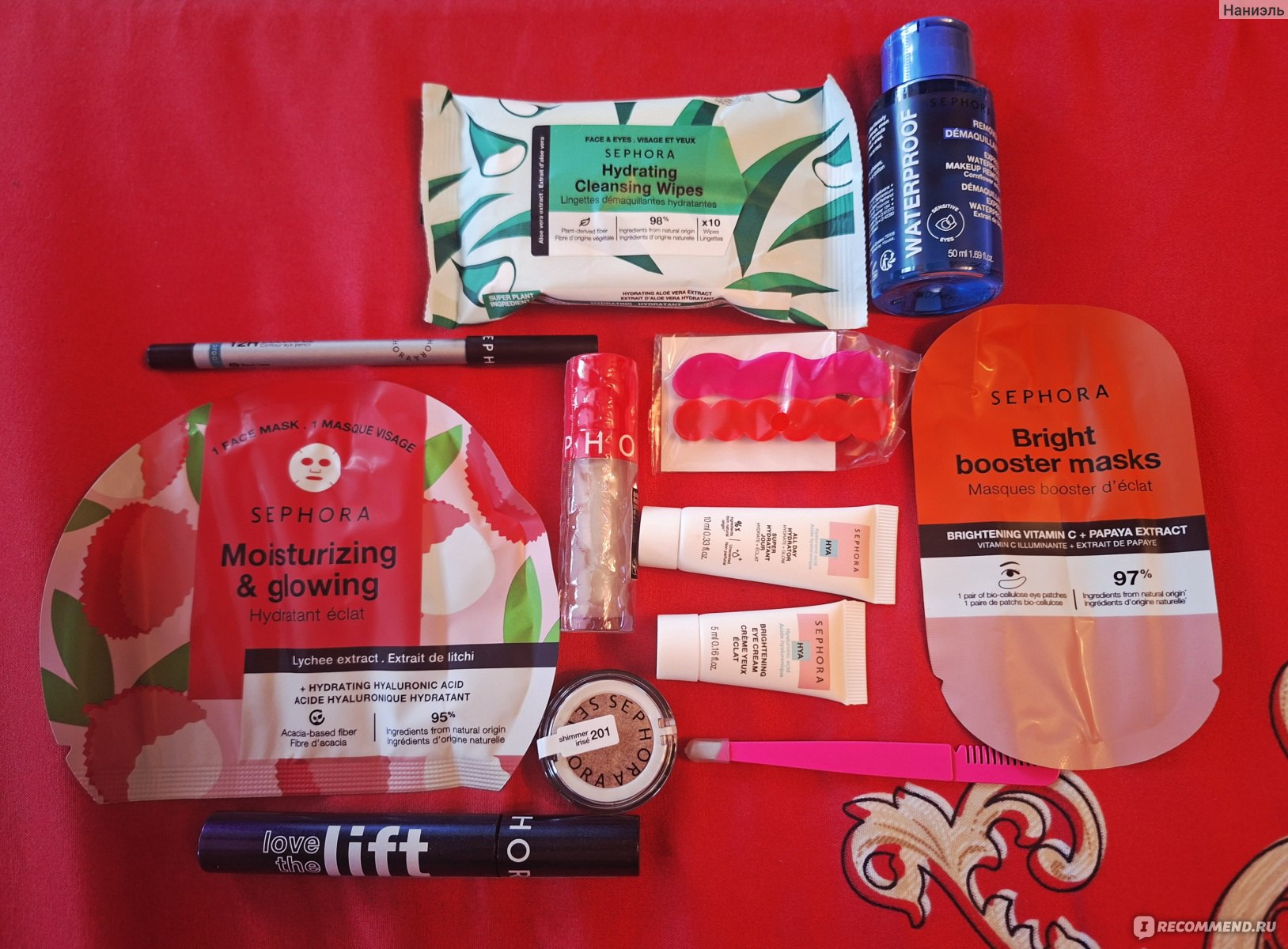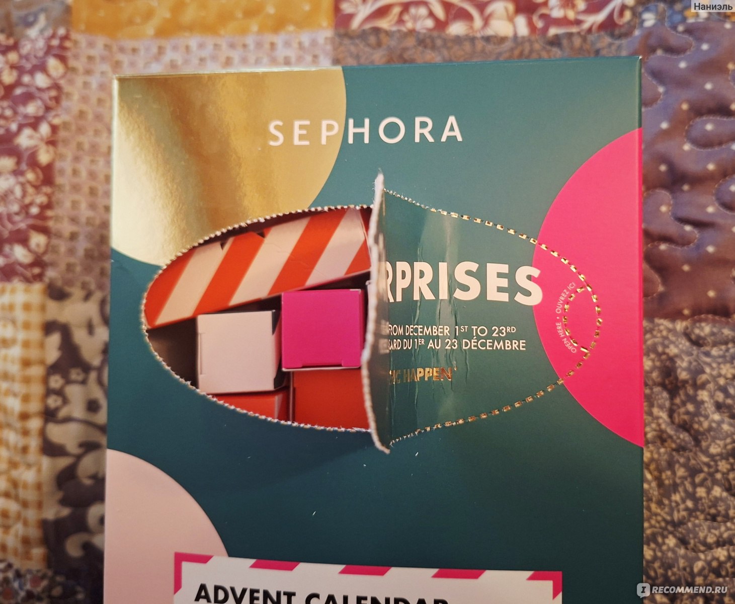 Искала адвент с небольшим количеством продуктов, которыми я не пользуюсь в целом. Нашла вот этот от Сефоры на 24 дня. Данный адвент самый простой из представленных на рынке, но достаточно "полезный": в нем есть туш, смывалка, карандаш для глаз, румяна, тени, умывалка, блеск для губ и резиночки - всё то, чем я пользуюсь каждый день. Все продукты отличного качества.