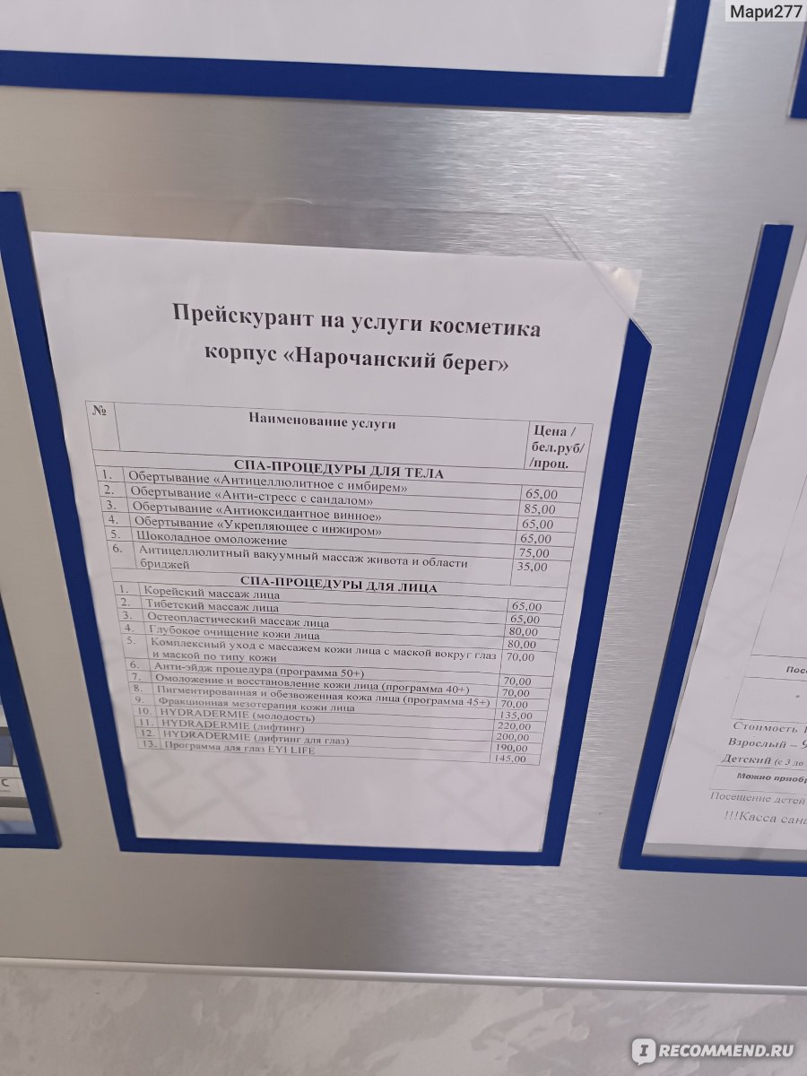 Минимальный комплекс процедур входит в стоимость путевки. Также можно купить косметические услуги.