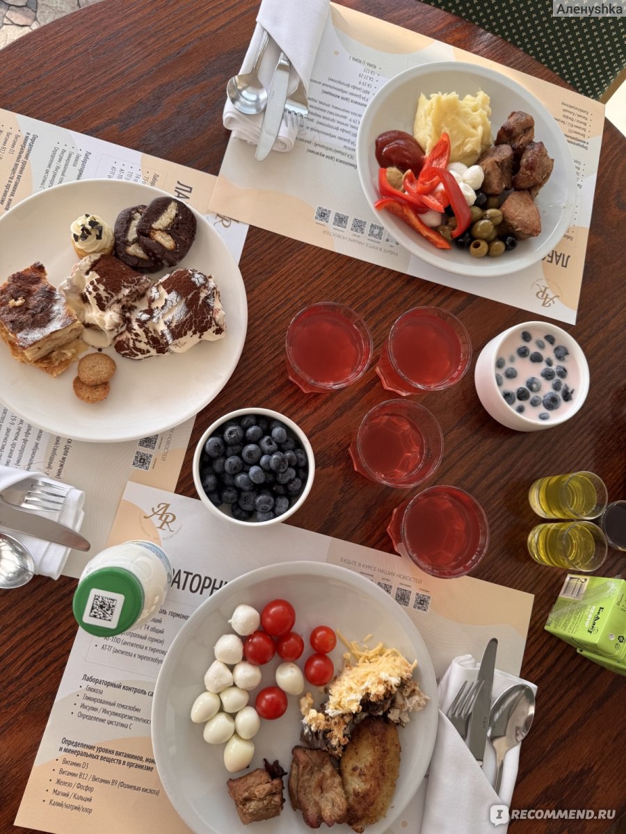 Номера чистые, единственный минус в душевой полка железная с которой всё падает. Заплатив такую сумму (около 300$ за сутки) я скептически относилась ко всему, но минусов получилось найти только пару. Это цена без лечения) Питаение 3-х разовое шведский стол, я еще тот придира в еде, качеству продуктов, я была приятно удивлена, перепелиные варёные яйца, помидоры черри, натуральный кофе. Детское питание в баночках. Вот только эклеры с растительным кремом расстроили.