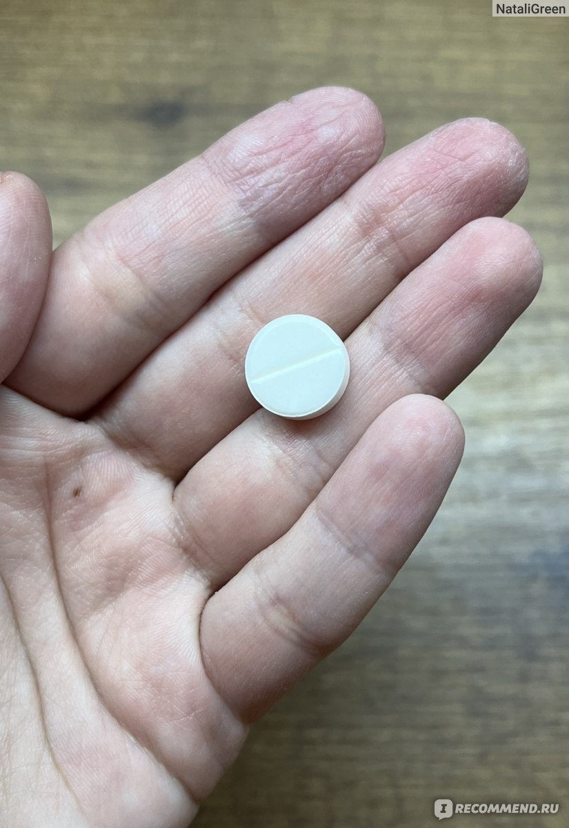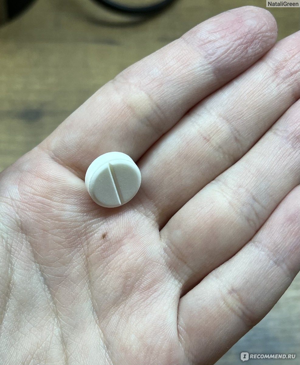 Таблетка среднего размера, не маленькая, круглая, белого цвета с риской посередине. Пахнет горьким лекарством. И на вкус еще гаже, то же самое горькое лекарство, умноженное на раз.