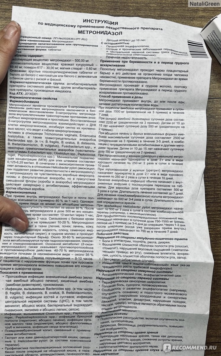 Что хочу сказать? Метронидазол - далеко не безобидный препарат, даже если врачи говорят обратное. Знаю, что они назначают его направо и налево, в нашей палате было 5 человек, и каждой был назначен Метронидазол + Доксициклин. Страшные побочки, и вероятно, это всего лишь верхушка айсберга. Неизвестно, насколько покалечен мой желудок изнутри после такого мощного препарата. Определенно сейчас я перешла на щадящую диету, и при малейших признаках боли, я буду принимать действия, чтоб защитить желудок и поджелудочную железу.