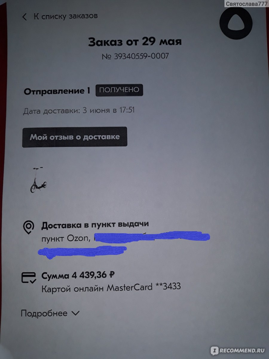 Заказали 29 мая, доставка была назначена на 4 июня с 17 до 21 часа. Но в итоге самокат приехал на день раньше. Забрать нужно было самовывозом из пункта выдачи. Посылка была весом 7 кг, муж сходил забрал.