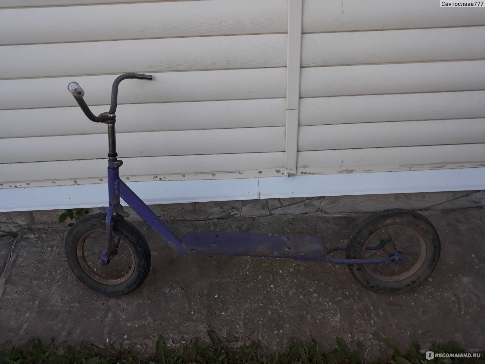 Муж сказал, что нам нужно принципиально другие самокаты -с надувными колесами, похожие на тот, что он сделал для дачи сам. А на даче у нас был самодельный самокат, в единственном экземпляре, с надувными колесами от старого детского велосипеда.