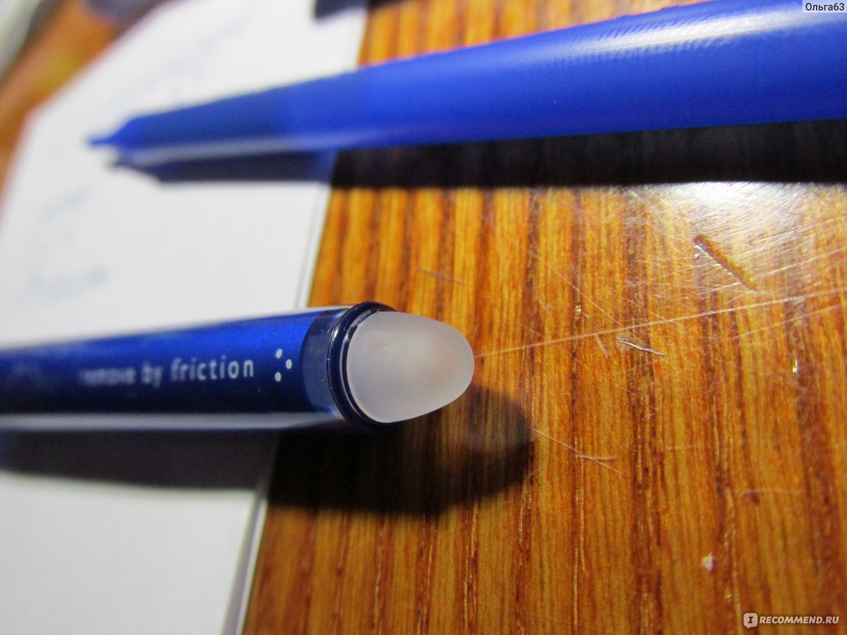 - на кончике ручки есть ластик, который стирает написанное практически бесследно, причем сам при этом не загрязняется, а выполняет функцию нагрева при трении или действии высокой температуры - зажигалки, спички или солнышка