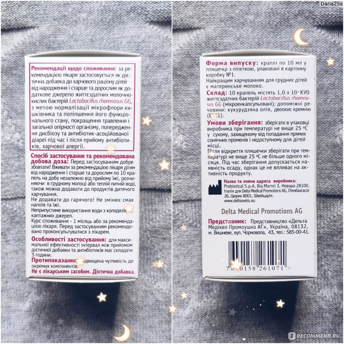 10 капель содержат: 1,0 х 109 КОЕ жизнеспособных бактерий Lactobacillus rhamnosus GG (микроэнкапсулированные); вспомогательные вещества: кукурузное масло, двуокись кремния (Е551).